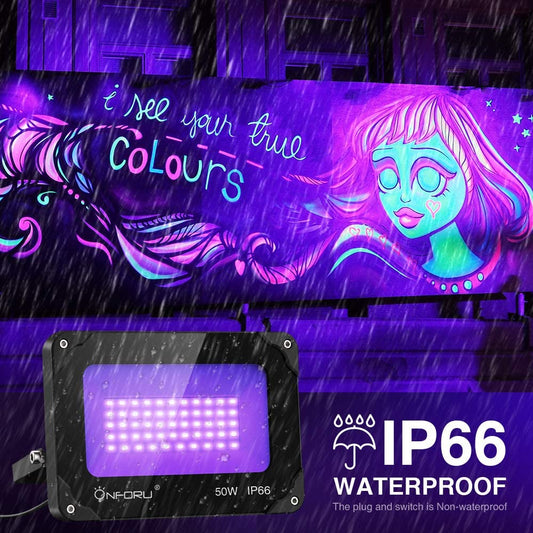 Onforu 2 Pack 50W UV LED Black Light, UV Floodlight with Plug, IP66 Waterproof Outdoor Ultraviolet Blacklight for Dance Party, Stage Lighting, Glow in The Dark, Fluorescent Poster, Neon Glow